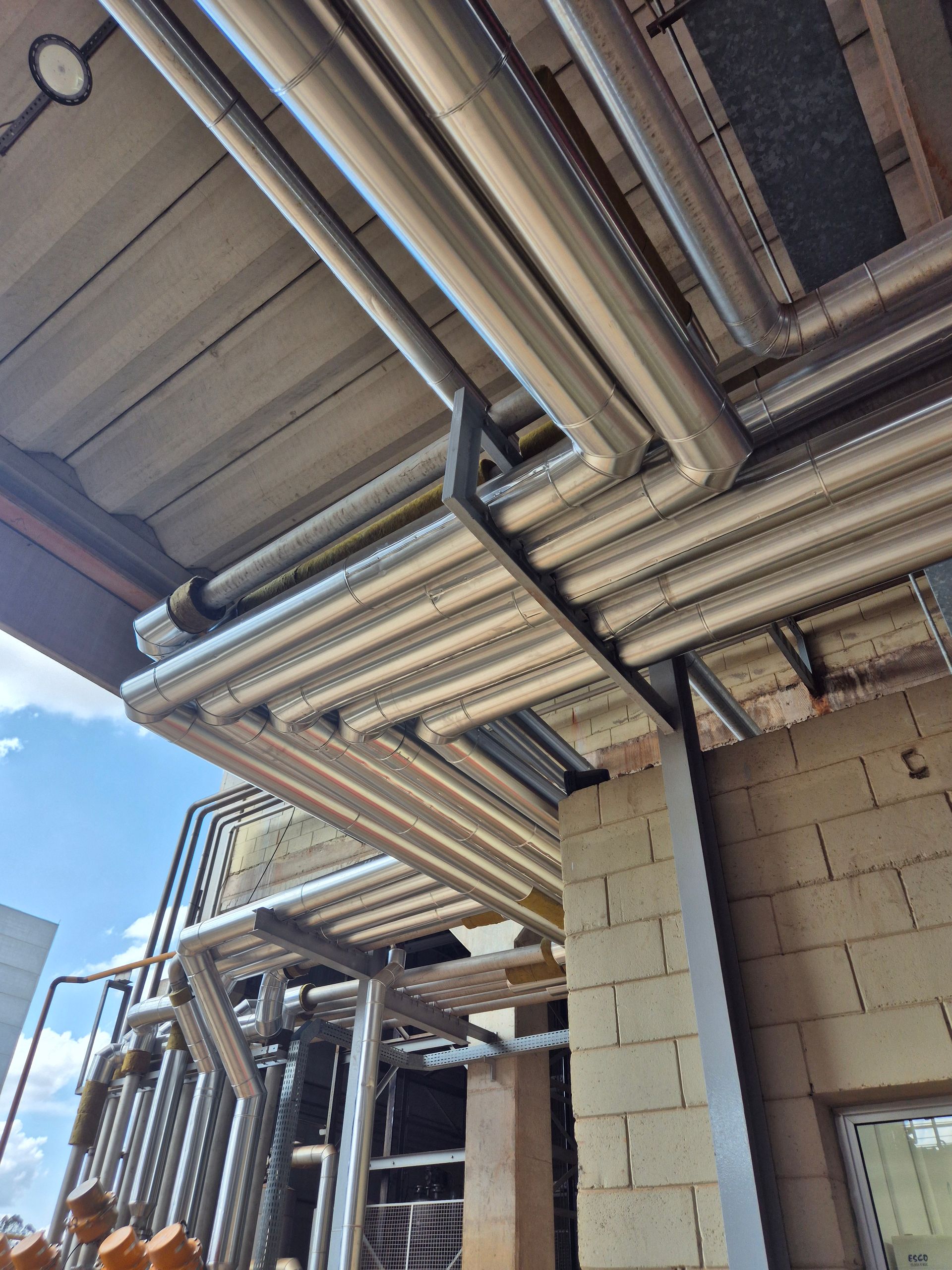Imagens de projetos concluídos em tubulações industriais, com aplicação de materiais isolantes adequados para altas e baixas temperaturas, e revestimentos metálicos que proporcionam durabilidade e estética.